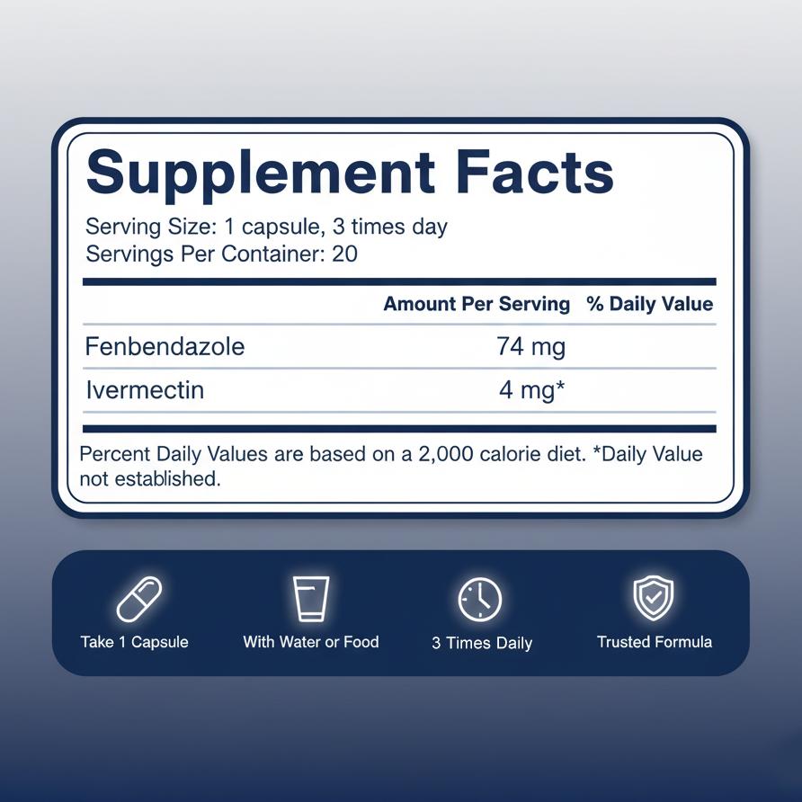 Each capsule delivers medical-grade Ivermectin and Fenbendazole—two clinically studied compounds used worldwide to target parasites, biofilms, and cellular waste.